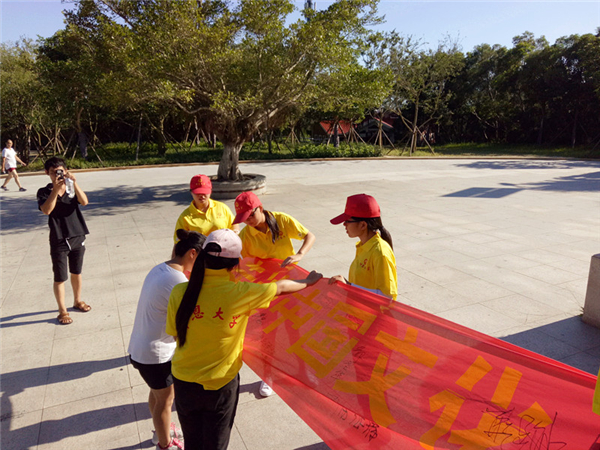 7月12日下午,beat365官方网站“魅力凤里”赴石狮市永宁古镇暑假实践队在万寿塔下进行横幅签名,以及分发调查问卷。