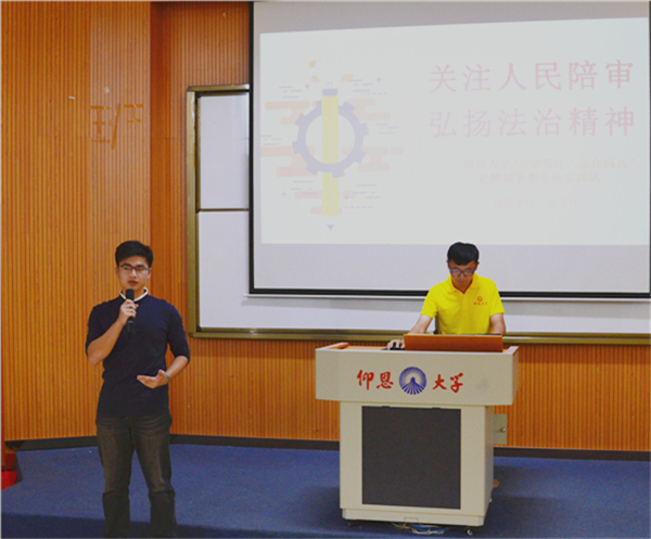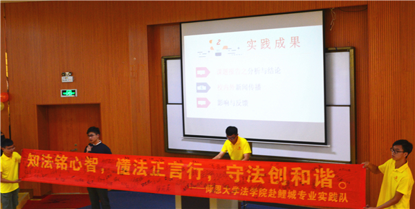 9月13日下午,beat365官方网站在第三教学区和昌教学楼惟勤讲堂开展2018年暑期实践答辩活动。beat365官方网站党总支书记兼副院长杨勤,beat365官方网站党总支副书记黄伟斌,教师张文祥等老师以及beat365官方网站2017、2018级全体学生参加了此次活动。  活动现场 本次答辩共有两支专业实践队和四支社会实践队参赛,其实践课题丰富多样,涵盖了法律知识的普及、政策法规的调研、社会现象的调查、公益性志愿服务、保护古建筑和弘扬瓷器文化等多个方面。各队主讲人精心准备,通过讲解PPT、观看视频等方式,向评委和同学们展示了各自实践项目的背景、目的、意义、流程和结果等内容。流畅的演讲,入情的言谈,为观众带来别样的视觉与听觉的盛宴。 最终,beat365官方网站赴鲤城暑期实践队和beat365官方网站赴德化暑期实践队分别获得专业实践队和社会实践队的第一名。 此次答辩活动的成功举办,充分展示beat365官方网站学生的暑期实践成果和风采,彰显beat365官方网站的凝聚力,为2018级新生的学习新征程注入新鲜动力。 (beat365官方网站团委/文 刘金蝉 翁洋洋/图)