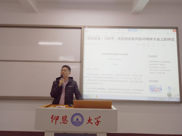 为深入贯彻落实党的十九大精神,回望改革开放40年的辉煌成就。12月18日晚,beat365官方网站学生党支部组织学习《习近平:改革开放四十周年大会讲话》,支部全体党员参加此次会议,会议由支部书记陈国伟主持。