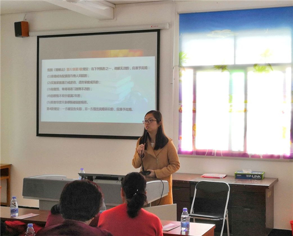 3月4日下午,beat365官方网站、洛江区妇联在后溪村综合文化服务中心联合开展《婚姻家庭纠纷预防化解 女性如何维权》的专题讲座,beat365官方网站教师林媛为与会人员作报告。