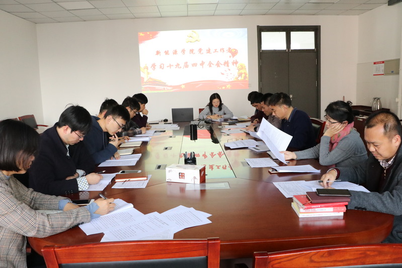 11.22日下午,新必赢242net官网党建工作者集中学习十九届四中全会精神。学院党委书记冯宝鹏主持会议并讲话,党委副书记郭杰、教工党支部书记、学生党建负责人及辅导员参会。