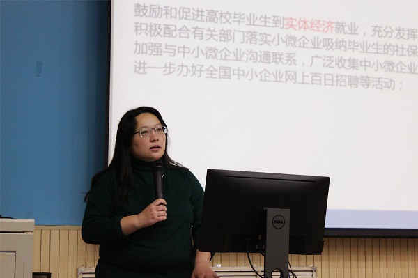会议伊始,窦雅琴围绕“明确未来职业生涯规划”的主题介绍“两个师兄的故事”,引导全体学生合理规划未来职业生涯。她提到职业生涯规划的基本理念,即包括大学积累、时代变化、决策行动等方面。针对当下大学生就业的普遍问题与解决要点,她提出“难在决策,重在行动”,引导全体学生合理规划、付诸实践。窦雅琴进一步讲解学业到职业的转换,就能源与动力工程、环保设备工程、过程装备与控制工程及电气工程及其自动化四个专业2019年就业率为全体学生作出分析,并以时间轴形式介绍大学学习各个阶段的重点,对读研与求职做出问题分解。随后,周辉以“凡事 看三步”为主题做出有关大学生面临的多方面的安全问题的讲解。他提出要多方面考虑问题,以宽容豁达的心态对待他人。他利用多种案例,从学业、娱乐、情感、话语及处理问题等多个方面,使学生明确安全的重要性。