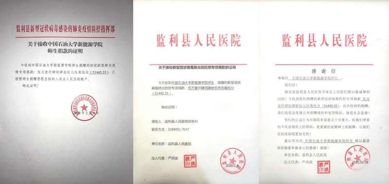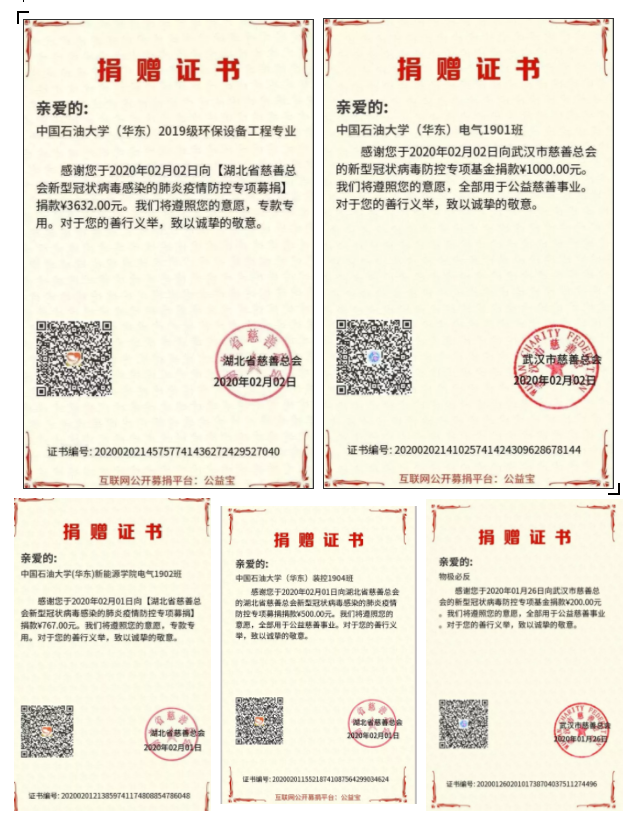 疫情发生伊始,部分学生班级和个人自发通过慈善机构奉献爱心,心系武汉。经不完全统计,2月3日之前,学生个人及班集体自觉自愿主动捐款12069元,捐赠部分卫生用品、医用手套400副、一次性口罩450个。集体名义有UPC微系统能质传输研究组及学生党支部捐款5500元,2019级环保设备工程专业捐款3632元,电气1901班捐款1000元,装控1904班捐款500元,电气1902班捐款767元等;个人名义有电气1904杨子昂捐款200元,电气1903牛海昕捐款100元等,此外,电气1903闫志伟、杨易达,电气1904吴岩分别向物资短缺医院捐献了医用手套等医护用品。