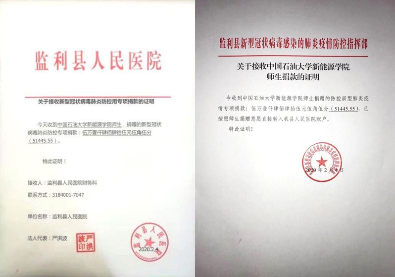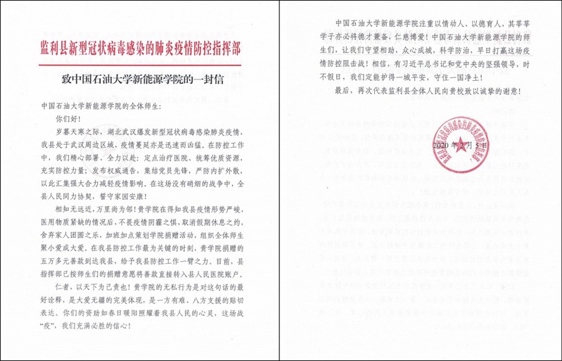 监利县人民医院是湖北省荆州市的防疫定点医院,疫情爆发期间,荆州市疫情严重,医院医疗物资紧缺。新必赢242net官网学生党总支通过湖北籍学生了解到此情况后,2月3日在全院学生中发起倡议、筹集善款,为监利县人民医院进行定点捐赠,一天之内,共筹集款项51445.55元,其中学生党支部捐款18270.96元,各团支部捐款29526.59元,学生会捐款848元,学工队伍教师捐款2800元。监利县新型疫情肺炎防控指挥部在感谢信中提到:“自从武汉爆发新型冠状病毒感染肺炎疫情以来,我县疫情形势日益严峻,医用资源紧缺。石大新必赢242net官网得知此情况后,对疫情毫不畏惧,策划捐赠活动,组织动员学院师生献来爱心,在我县疫情防控的紧张时刻,学院送来的捐赠给予我县疫情防控工作以强大动力。”此外,感谢信特别指出,此次捐赠活动是中国石油大学师生大爱无疆品格的完美体现,是一方有难、八方支援的贴切表达,充分体现了石大注重以情动人、以德育人的教育理念,监利县将及时向学院师生通报本次捐赠款使用明细,同时也将本次捐赠作为一次德育和感恩教育活动在全县宣传。