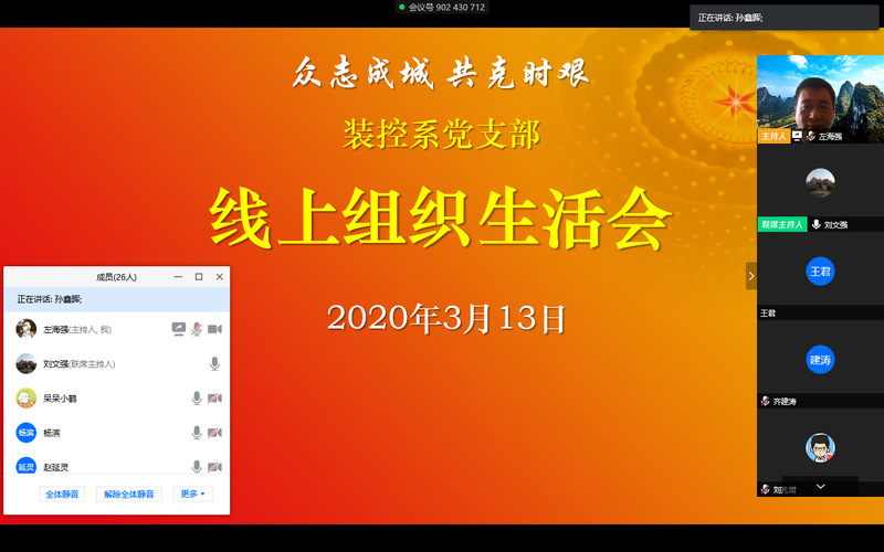 3月13日下午,装控系党支部开展新冠肺炎疫情防控专题线上组织生活,会议由支部书记左海强主持,支部26名党员通过会议客户端远程参加。左海强首先传达了近期学校疫情防控领导小组发布的有关通知要求,介绍了支部在疫情防控方面的自愿捐款情况,强调当前要坚定防疫必胜信心,慎终如始,不麻痹、不厌战、不松劲,继续保持防范意识,减少不必要外出,不参加集会聚会,认真做好自我防护,咬紧牙关坚持到底,同时以高度的责任心认真开展好在线教育教学。在党建方面,本学期要继续丰富和完善支部“基石”党建工作法的内涵,进一步发挥每名党员的积极性和主动性,把支部建设成为能够攻坚克难的战斗堡垒。
