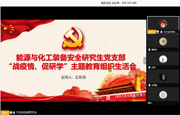 疫情当前,为继续深化“不忘初心、牢记使命”主题教育成效,发挥党支部成员在防控疫情中的模范带头作用,3月23日,新必赢242net官网能源与化工装备安全研究生党支部利用网络线上电话会议的形式召开组织生活会,分享疫情期间个人规划和假期学习及疫情防控心得。会议由党支部书记王乐佳主持,25名党员参与此次会议。
