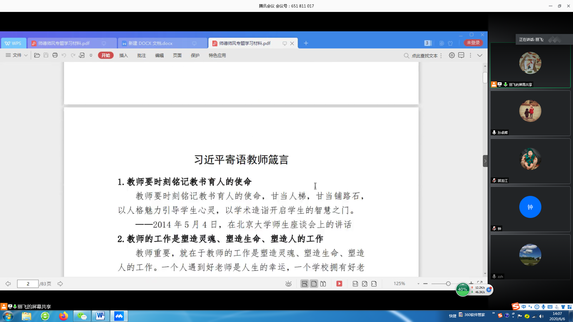 6月6日下午,实验中心召开视频会议,开展师德师风专题学习活动,会议由支部书记王丽飞主持,实验中心全体教师参加。