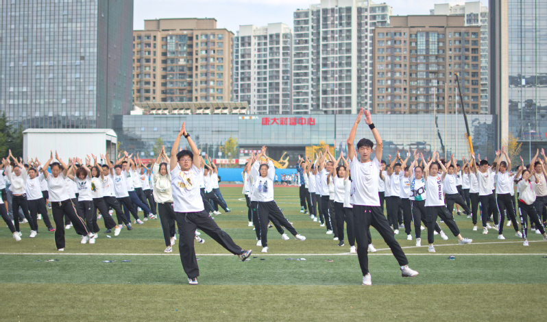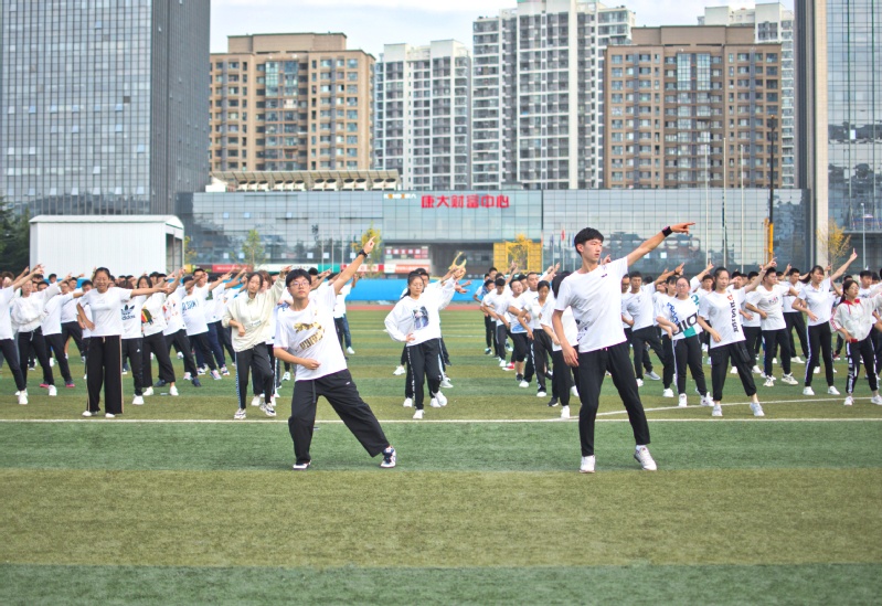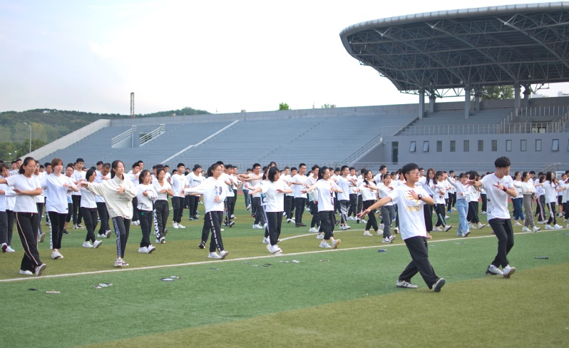 初秋清晨六点四十,操场上传来欢快悦耳的音乐“你笑起来真好看,像春天的花儿一样”,与之相伴的是整齐的拍手和跺脚的声音。操场中间,数百名新生由6名学生带领,跳跃着轻快的的步伐,用舞步开启新的一天。