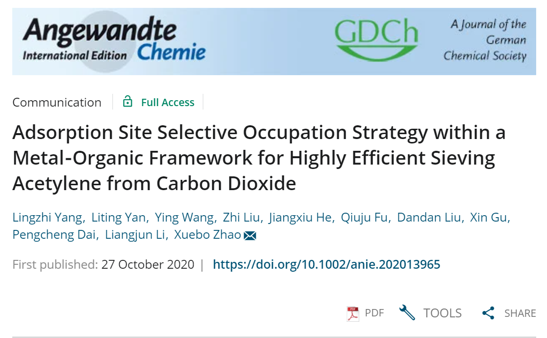 近日,必赢官网储能科学与工程系赵学波教授团队在乙炔和二氧化碳混合气体分离研究方面取得重要进展。相关研究论文《AdsorptionSite Selective Occupation Strategy within a Metal‐Organic Frameworkfor Highly Efficient Sieving Acetylene from CarbonDioxide》(通过吸附位点选择性占据实现乙炔/二氧化碳高效分离)在国际化学领域顶级期刊AngewandteChemie InternationalEdition发表。博士研究生杨灵志为论文第一作者,赵学波教授为通讯作者,中国石油大学(华东)为第一署名单位和唯一通讯单位。该项研究成果得到国家自然科学基金和山东省泰山学者项目资助。