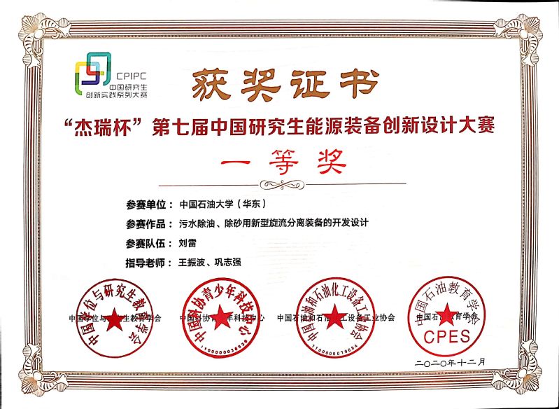 1 | 刘雷 | 2018 | 其他能源装备 | 污水除油、除砂用新型旋流分离装备的开发设计 | 一等奖 | 王振波、巩志强 |