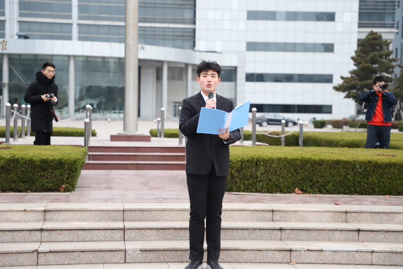 仪式进行第一项,王圣钧宣读本次升旗仪式的开场词,引出此次升旗仪式的主题,即铭记历史、奋斗未来。随后,仪式进行下一项,升国旗、奏唱国歌,国旗护卫队成员升起国旗,全场学生代表齐唱国歌、行注目礼。礼毕后,由校学生会主席、校研会副主席王玉杰进行国旗下演讲,他强调当代青年要铭记历史,坚定政治立场,承担新时代青年的使命和历史责任。紧接着,各院部学生会主席及研究生会主席共同演讲《铭记历史·共筑青春》,其中新必赢242net官网学生会主席窦玉在演讲中表示:“人的青春是用来奋斗的,身为大学生的我们,只有脚踏黄土地,肩负民族任才能引领中国梦的潮流。”仪式进行最后一项,由学校学生会组织部部委、新必赢242net官网学生会成员李维凯带领全体人员共同宣誓。至此,升旗仪式正式结束。