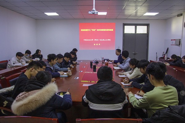 会议伊始,张荣华教授讲解四史的具体内容,学习四史即是学习党史、新中国史、改革开放史、社会主义发展史。他指出学习“四史”是当前青年一代必须学好的“必修课”。随后,张荣华教授深入浅出地讲解学习“四史”的价值意蕴,“四史”可以让党和群众从中汲取历史智慧,提高历史思维能力;把握三大规律,增强“四个自信”;正确把握历史的本质,反对历史的虚无主义。在场人员牢记了祖国经历的苦难和辉煌,明确了新时代青年所肩负的历史使命和社会责任。接下来,张荣华教授着重讲述“四史”的核心要义,告诫青年要牢牢掌握马克思主义、中国化马克思主义理论的精髓;汲取历史进程中积淀而成的精神力量;继承中国革命建设、改革的优良传统。会议最后,张荣华强调在场人员要了解中国近代以来的斗争史,党成立以来的奋斗史,改革开放以来的发展史,来形成青年正确的历史观、世界观、人生观、价值观。
