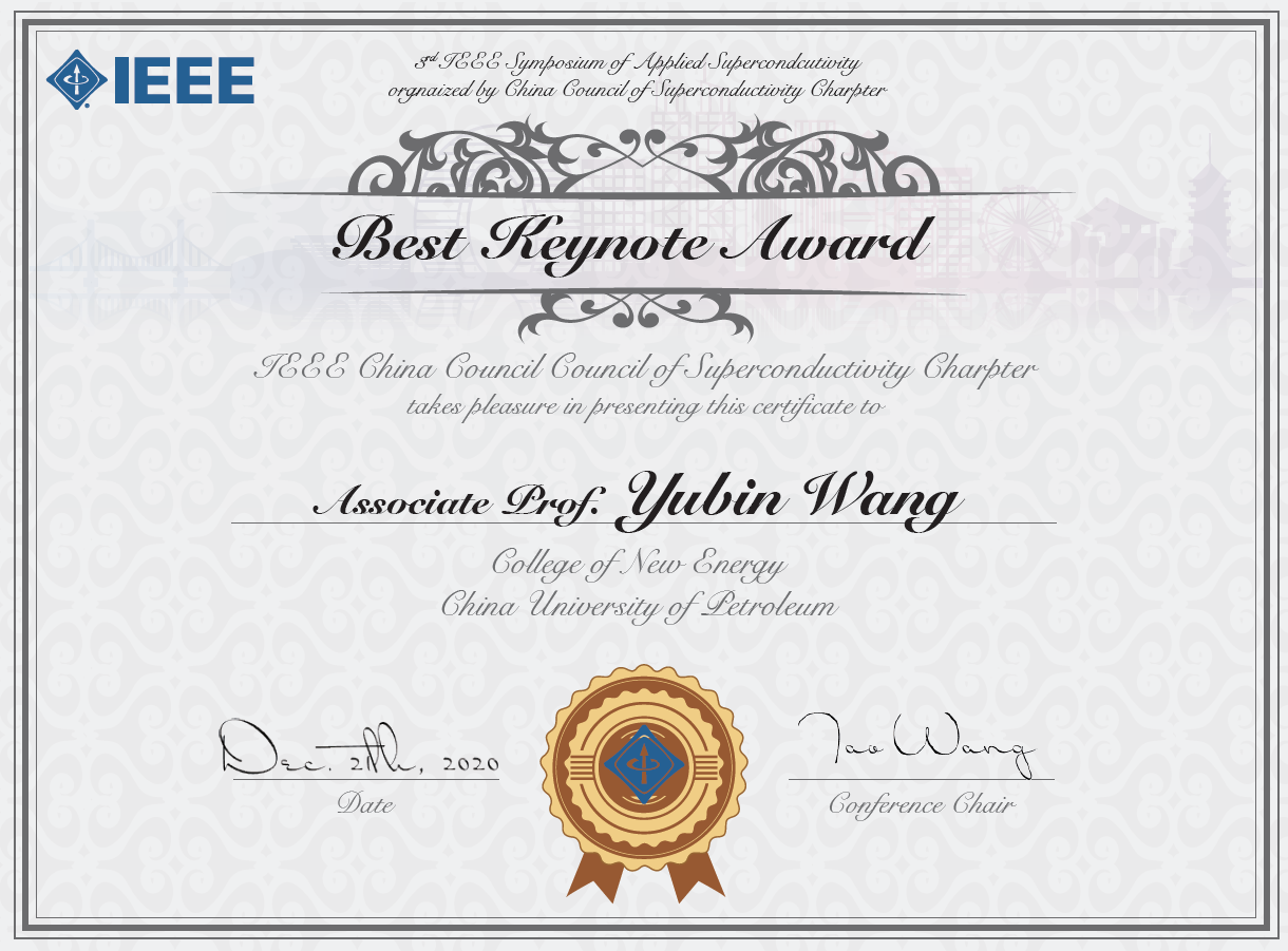 12月20-21日,第三届应⽤超导学术年会在浙江省湖州市举行。会议围绕医用电磁装备用、电机/风机用、储能与聚变用超导磁体及其建模分析新方法与新理论展开研讨。必赢官网王玉彬副教授应邀参会并作了题为“定子励磁静态密封高温超导电机研究进展”的主题报告,取得了良好效果与反馈,荣获最佳主题报告奖。