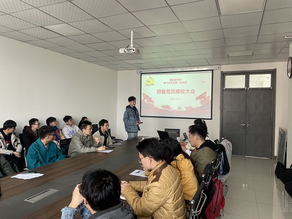 3月14日,新必赢242net官网电气工程及其自动化本科生第一党支部在特种楼C431会议室召开预备党员接收大会,本次会议由电气本科生第一党支部副书记陈文淙主持,主要讨论是否接收电气1806贺春旺和电气1802李泽两位同志为预备党员的问题,全体支部党员和预备党员参加会议。