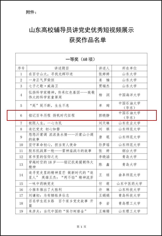 本次比赛由教育部高校思想政治工作队伍培训研修中心主办,山东省委教育工委指导。参赛作品经个人申报、高校推荐、专家评审,共评选出一等奖作品 68 项,二等奖作品 103 项,三等奖作品 151 项。必赢官网辅导员郭晓静作品《铭记百年历程 扬帆时代征程》入选并被推荐参与山东省的评比,最终获评“山东高校辅导员讲党史优秀短视频”一等奖。