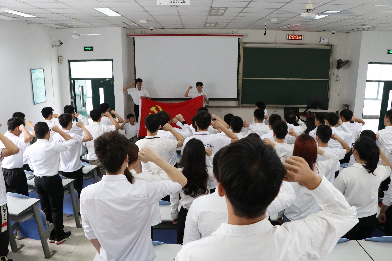 大会结束后,唐岛湾校区学生党员面向党旗,重温入党誓词。以青春的名义向党许下铮铮誓言:“在新的百年,听党话,感党恩,跟党走”,以青年之身份庄严承诺:“请党放心,强国有我。”