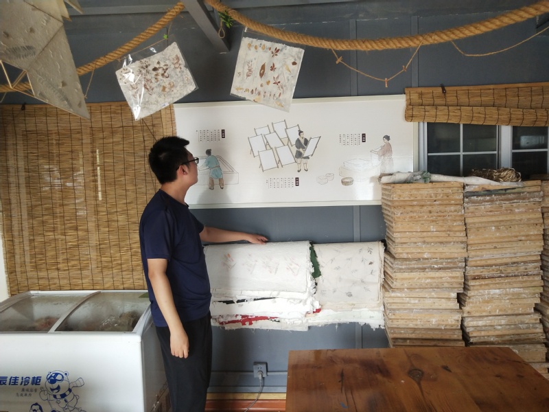 实践当天,在工作人员的带领与介绍下,实践队员们了解到山东非物质文化展示体验中心以特色小木屋为主体,沿游览路线划分为三大板块,分别是:商业街区、餐饮配套区及非遗展示体验区。体验中心在薪火相传中体现中华民族的传统美德,以非遗相关的产业为主导,配合国家及政府相关政策,积极开展有利于新区发展的文化旅游活动,并将非遗文化与现代旅游相结合,着力于打造新区特色的旅游研学新地标,让广大游客能够在非遗中心体验到来自全国各地特色的传统文化,带动新区旅游业的发展。随后实践队员们了解并参观各类非遗项目,其中包括造纸术、活字印刷术、传统剪纸、木版年画及脸谱等各类非遗项目。在造纸术展示体验间,实践队员们尝试应用古法造纸的工艺,将树叶在纸浆中排列以制作出了极具美感的工艺品;在传统剪纸展示体验间,于此工作的老爷爷在拉动二胡,老奶奶用剪刀在红色的纸上剪出诸多生动的图画,吉祥的红色映衬下,有花开富贵的传统祝福,也有党领导人民携手共进奔小康的真切赞颂;在木版年画展示间,威武的门神、祭祀的长者、调皮的孩童为木板与布帛带来了别样的生机。