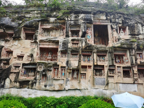 此次社会实践分为线上线下两部分,实践队组长岳逸轩带领大家调研制作了一份“当代青年对传统文化了解程度及未来发展看法”的调查问卷用以调查了解并研究人们对家乡优秀传统文化的关心了解程度,以及如何看待传统文化在信息化、全球化冲击下的未来发展。根据问卷结果可得知大部分青年对家乡的传统文化只是粗略了解并不全面,很难达到传承优秀文化的目的。针对此类现象,实践队队长岳逸轩带领两位实践队队员实地参观四川省巴中市南龛坡隋唐时期遗留的摩崖石窟及壁画等文物。南龛石窟,即巴中南龛摩崖造像,始创于隋,盛于唐,不断增镌,形成了规模宏大的石窟群。现有造像一百七十六龛,二千七百余尊,有经幢一座,造像碑十七则,严武(唐巴州牧)“奏表”碑一幅,题记三十五条,诗文等五十一首,造像精巧玲珑,姿态各异,是古代劳动人民巧夺天工的艺术精品,是巴中古文化的历史见证。三位实践队队员认真聆听并记录解说员关于摩崖石窟的解说后,开始自行向路人宣传自己所了解的摩崖石窟,致力于让更多人了解巴中市的传统文化。实践队队员杨继成表示:“此次实践活动让我更加了解了我家乡的传统文化,也让我油然而生出一种责任感—宣传家乡文化,让更多人了解它。”