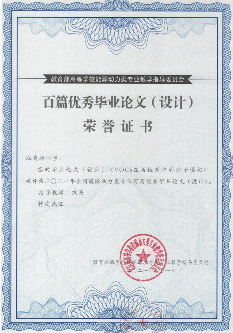 8月28日,教育部高等学校能源动力类专业教学指导委员会主办的首届(2021年)全国能源动力类专业优秀本科毕业论文(设计)展示交流活动在山东大学落下帷幕。必赢官网能动1702班池爽赫同学的毕业论文《VOCS在活性炭中的分子模拟》被评为全国能源动力类专业百篇优秀毕业论文(设计),论文指导教师为巩亮教授。