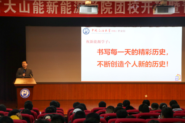 其中,刘积舜列举了闫子元、王启明等优秀石大人的事迹,激励学生深刻领悟“家国同心,艰苦奋斗,惟真惟实,追求卓越”的石大精神。在讲解石大精神的同时,刘积舜着眼于现实,总览石大发展线程,展望石大的蓝色未来。刘积舜对在场大学生提出“大学生应以史为鉴,开创未来,走好大学之路”的要求。“书写每一天的精彩历史,不断创造个人新的历史!”最后,刘积舜寄语新能源学子。