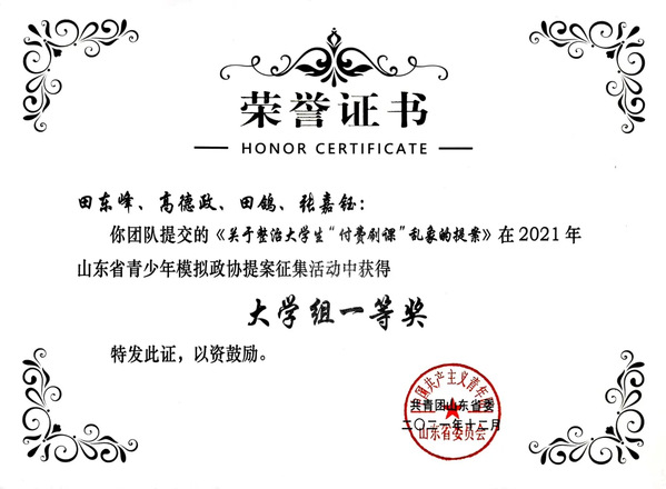 田东峰带领团队高德政、田鸽、张嘉钰聚焦“刷课现象”,对大学生“付费刷课”问题进行深入调研并提出建议。团队撰写并提交的《关于整治大学生“付费刷课”乱象的建议》获得山东省青少年模拟政协提案征集活动大学组一等奖,同时获得“民声连线·青年建议上两会”评选点赞活动山东省第三名,被收入2022年《民声连线听民声》集册,并作为省政协十二届五次会议材料交与参会委员。