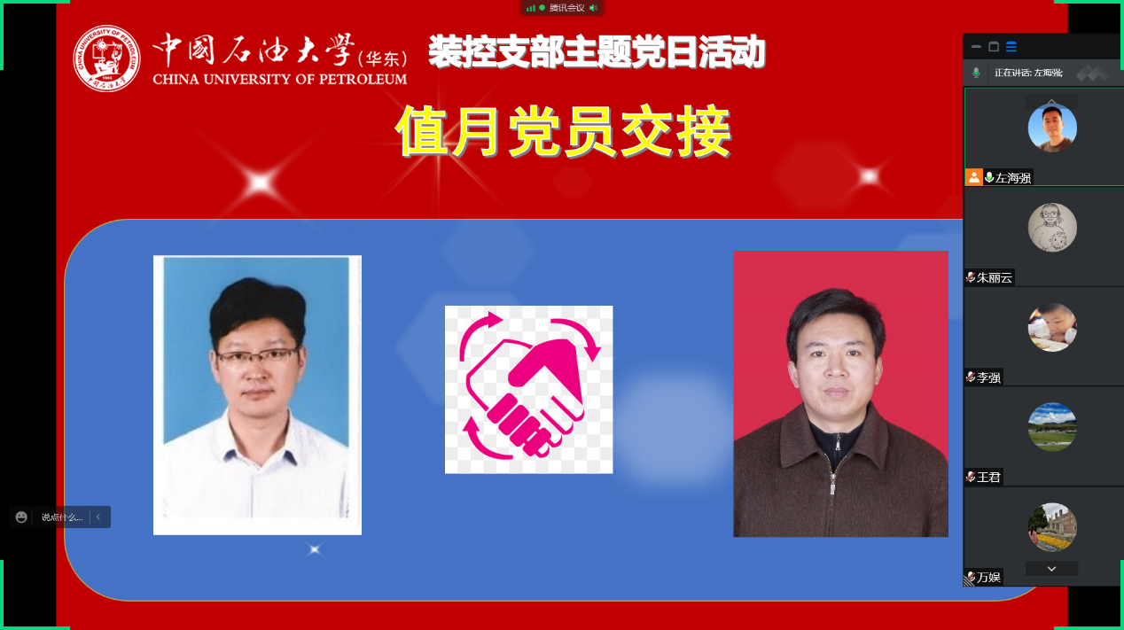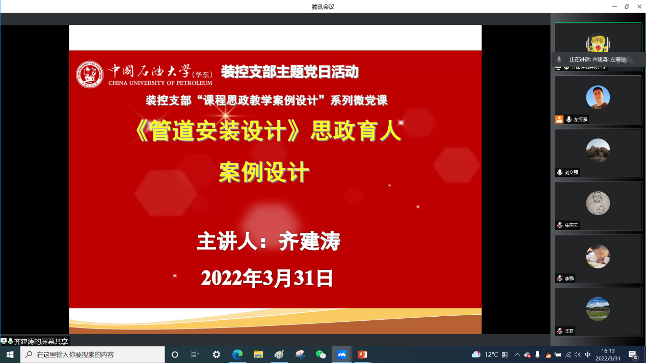 331日下午,装控系党支部开展本学期第一期“课程思政教学案例设计”系列微党课活动,活动由支部书记左海强主持,因疫情关系本次活动采用腾讯会议形式线上进行。