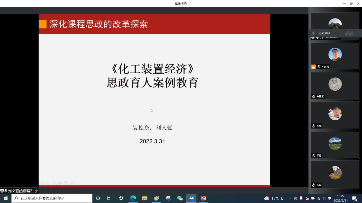 首期由左海强、齐建涛、曲燕和刘文强四位老师进行课程思政教学案例设计分享。左海强老师以《过程设备设计(2-2)》思政育人案例设计为题进行介绍,课程绪论部分引入习近平总书记20211021日在视察胜利油田时的讲话:“能源的饭碗必须端在自己手里”鼓励同学们努力学习本领,以科技创新开发石油化工高端装备,提升石油能源利用效率,高质量端好能源的饭碗。在存储设备章节将国家战略石油储备如何服务国家能源安全等思政元素有机融入课堂教学。齐建涛老师以《管道安装设计》思政育人案例设计为题进行介绍,课程中将大连新港“7·16”石油管线爆炸救援中的消防战士桑武冒着生命危险毅然冲入爆炸不断的火场中心,忍着灼烧的剧痛徒手将阀门转了32000圈最终关闭泄漏原油的储油罐阀门,创造我国火灾扑救史上的奇迹这一案例有机融入课堂教学。曲燕老师以《传热强化技术》思政育人案例设计为题进行介绍,课程中将中国力争2030年前实现“碳达峰”, 2060年前实现“碳中和”,鼓励同学们抓住新能源变革机遇,永葆“热”情,攻坚克难,建功立业这一思政元素有机融入课堂教学。刘文强老师以《化工装置经济》思政育人案例设计为题进行介绍,课程中将中国石油化工发展历史、一带一路等思政元素有机融入课堂教学。四位老师的分享给了老师们很大启发,其余老师也对四位老师讲解的思政育人案例中如何更好的融入思政元素提出了更多有价值的建议。