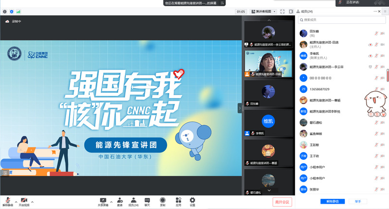 为引导广大青年学生深刻认识碳达峰碳中和政策的重大意义,宣传绿色核能发展理念,5月1日,新必赢242net官网能源先锋宣讲团联合青西新区实验初级中学举办第一次“强国有我,核你一起”线上宣讲活动。活动由能源先锋宣讲团团长田鸽主持,能源先锋宣讲团团员李云菲、曹颖主讲,青西新区实验初级中学学生参与。