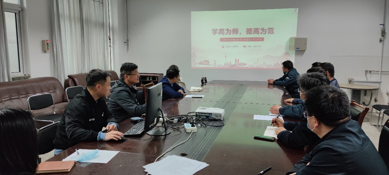 接下来,支部开展了师德专题学习教育活动,青年教师解学方老师结合自身实际,与大家一起分享了学校青年教师岗前培训《高等学校教师职业道德规范》的学习心得《学高为师,德高为范》。全面解释了作为高校教师职业道德规范“爱国守法、敬业爱生、教书育人、严谨治学、服务社会、为人师表”的内涵和要求。左海强带领支部全体党员教师学习了习近平总书记425日在中国人民大学考察时的重要讲话精神,要求全体教师要始终坚持党的领导,坚持马克思主义指导地位,坚持为党和人民事业服务,落实立德树人根本任务,传承红色基因,在教书育人过程中明确“为谁培养人、培养什么人、怎样培养人”这一根本问题。