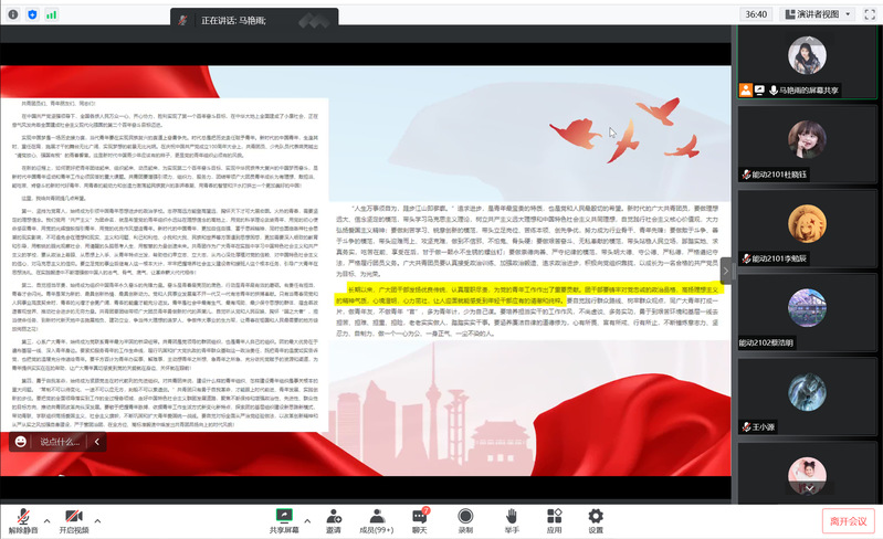 以实际行动展现新时代共青团员之精神风貌,理解新时代的伟大成就、感悟新时代的鸿篇巨制和磅礴伟力,9月24日,电气2007、能动2101、2102、2103、2003团支部开展线上“喜迎二十大、永远跟党走、奋进新征程”暨“新时代的伟大成就”主题团日活动,本次活动由电气2007团支书马艳雨主持,各团支部全体成员参加。