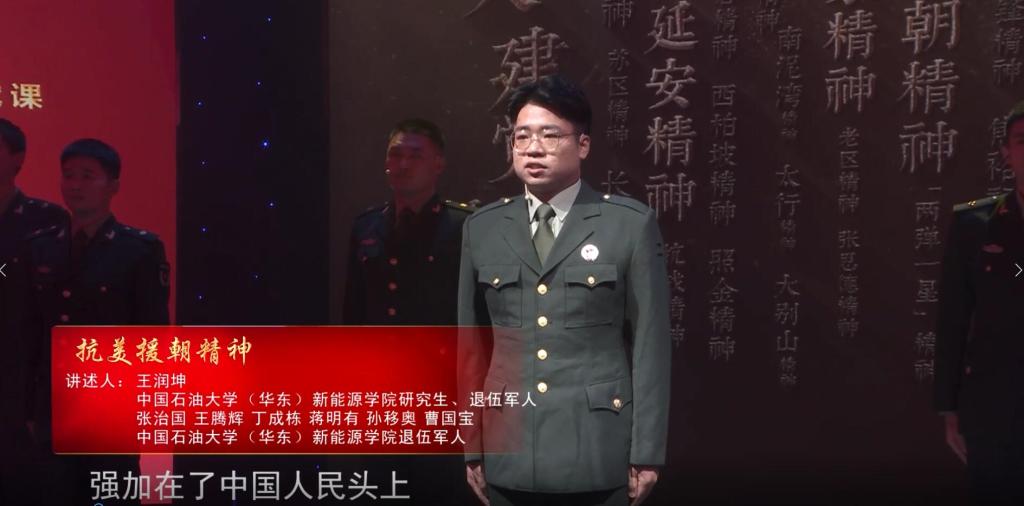 石大山能新必赢242net官网研究生、退伍军人王润坤讲述了“抗美援朝精神”,在与革命先辈的时空对话中,喊出了“投身强国伟业,彰显青春担当!”的铮铮誓言。
