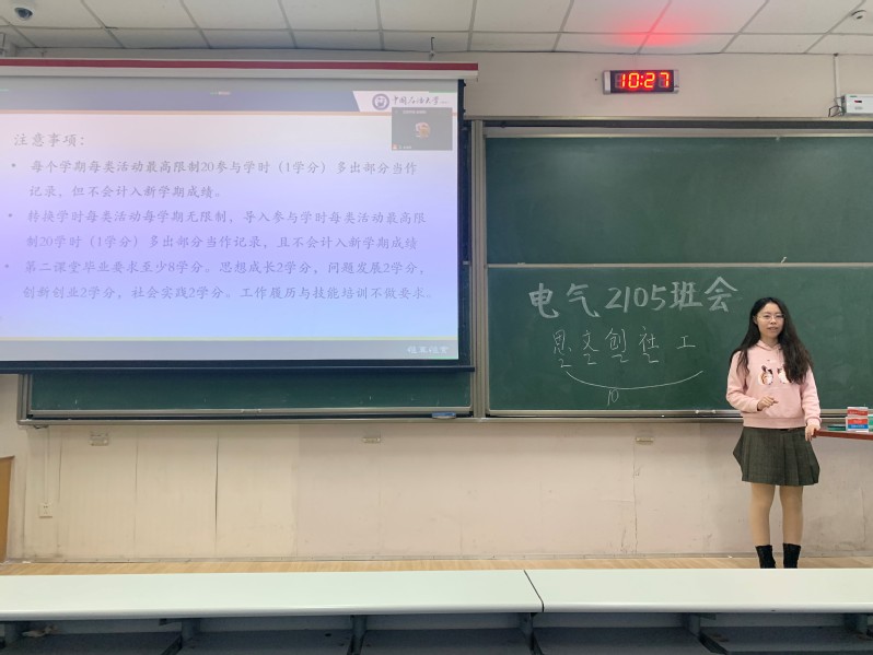 活动伊始,彭庭森对本次班会开展目的进行强调,并对会议内容进行简要介绍。随后,么旻蕊从“第二课堂学分预警”“入团入党相关要求”“参保信息及时确认”三个方面讲述了近期班集体需要完成的工作任务。其中,针对部分学生面临的学分预警问题,么旻蕊详细介绍了第二课堂成绩组成及毕业学分要求。接着,董磊对电气专业分班以来的人员变动、班委调换、疫情防控等情况进行分析总结,并指出大学生培养适应能力的重要性。同时,他以其他各年级学生情况为例,提出学生应发挥个人主观能动性的要求,及时明确个人目标,积极参加学校组织的各类活动。他希望学生能做到“课程学业创新创业两手抓,成绩竞赛两不误”。班会结束后,电气2105心理委员王嘉怡组织全班学生通过做游戏的方式进行大学生团体心理辅导,她表示疫情形势下学生需要学会适当放松进行调整以便于学生能全身心投入到个人学习与生活中。