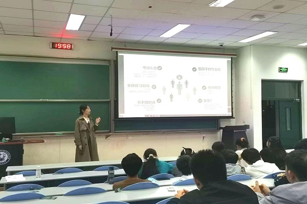 会议伊始,苏亦蕊对班级期中考试成绩进行分析总结,提出在学习过程中要深化知识点的理解、建立完整知识体系、提高主动学习热情、加强合作学习力度;随后,董磊就期中考试成绩,指出学生要优化学习方法、适应自学状态、摆脱被动学习心态,课后积极联系、询问任课老师,接着董磊根据健身节学生报名积极性,要求学生培养集体意识,在提高成绩同时注重全面发展,抓住机会展示自我,为班级发展贡献力量。而后,金琼婷、吴岩、谢能仪分别针对学习方法、考前复习、竞赛赛前准备和生活态度等方面交流方法、分享自身经验,提出大学期间应积极参加各种活动,发展自己兴趣爱好。最后,苏亦蕊宣布期末考试前班级开展集体自习的学习方案,鼓舞学生积极进入期末备考状态。