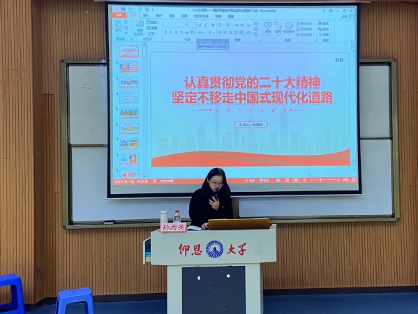 为了学习宣传贯彻党的二十大精神,弘扬光荣传统,赓续红色血脉。12月1日下午,马克思主义学院优秀教师孙海英来到beat365官方网站作《认真贯彻党的二十大精神,坚定不移走中国式现代化道路》报告,宣讲党的二十大精神。beat365官方网站全体师生参加聆听本次宣讲报告会。宣讲会由beat365官方网站团委书记吴姗姗主持。