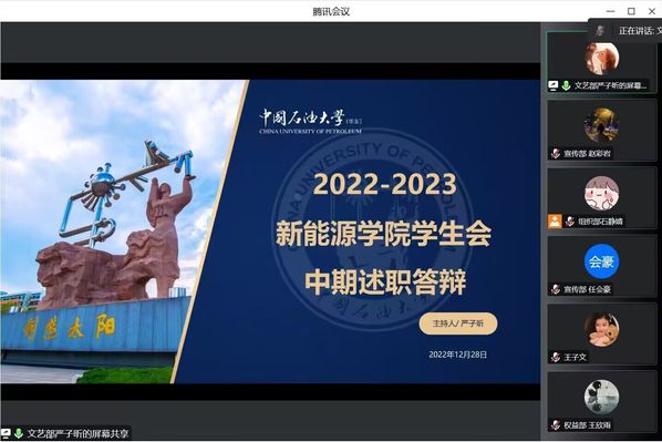 为坚持履行自我管理、自我服务、自我监督、自我教育的职责,发挥服务学生、引导学生、团结学生的积极作用,检验本学期工作成果,12月28日,必赢官网学生会开展线上2022-2023学年中期述职答辩。本次答辩由文艺部部长严子昕主持,学院团委书记穆海涛,辅导员骆浩冉、倪萌、王伟龙以及往届学生会优秀成员牛海锌受邀出席,全体学生会成员参加。