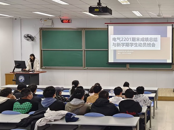 为分析班级学生在期末考试成绩中暴露的问题,端正新学期班级同学学习态度,电气工程及其自动化2201班于3月21日在西环101举办期末考试成绩总结会。会议主要由班长苏亦蕊主持,电气2201班全体学生参加,班主任董磊应邀参会。