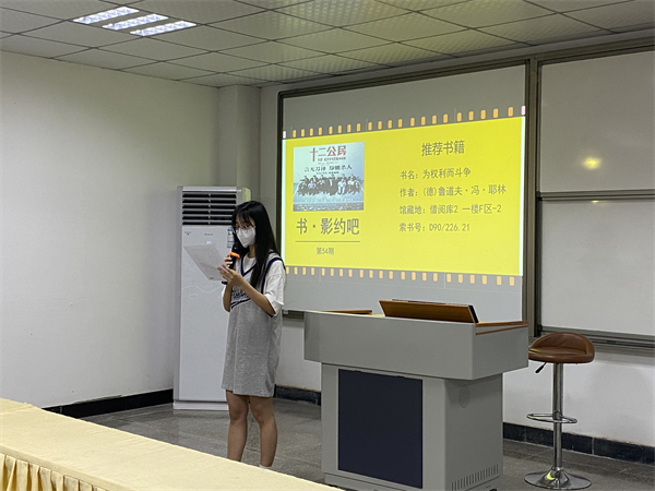 观影前,主持人上台介绍了本次活动的推荐书籍《为权利而斗争》,简要概括了其影响力、内容以及借阅位置等相关事项,紧接着进入本次活动的正题——《十二公民》的观影活动。《十二公民》讲述的是一桩满带争议与疑问的富二代弑父案,一个充满实验意味的虚拟法庭,将12个毫无联系并代表着社会各阶层的普通人聚在了一起。 12名陪审员围绕“富二代弑父”的案子展开激烈辩论,他们的讨论将决定被告的“生死”。该片借经典法律题材探讨通识,以群像的方式真实反映了中国社会现状,展现偏见的同时又表达对于公义的追求,以经典的法律戏剧文本去试练当下的中国社会,使得每一位观众都能够和它产生共鸣,具有现实意义。