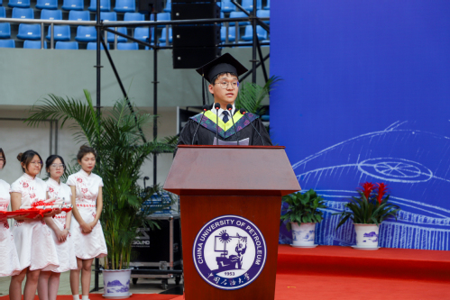 为表达对学院对美好的祝福和深深的不舍,2023届毕业研究生李玥嬛代表全体毕业生向学院送上鲜花,随后李玥嬛、田东峰分别代表毕业研究生和毕业本科生上台发言。李玥嬛谈到,“无论我们身处何方,有何境遇,都应时刻谨记‘惟真惟实’的校训,秉持初心,砥砺奋进,再续华章。我们将用所思所学所为为社会的进步与国家的发展贡献自己的每一寸光芒。”田东峰表达了对母校建校70周年的祝福,同时祝愿所有毕业生学业有为、事业有成,“今年是母校建校70周年,我想借此机会代表所有毕业生,把最美好的祝福送给母校,我们也一定会传承石大精神,在建功立业的广阔舞台上书写自己的人生华章!”