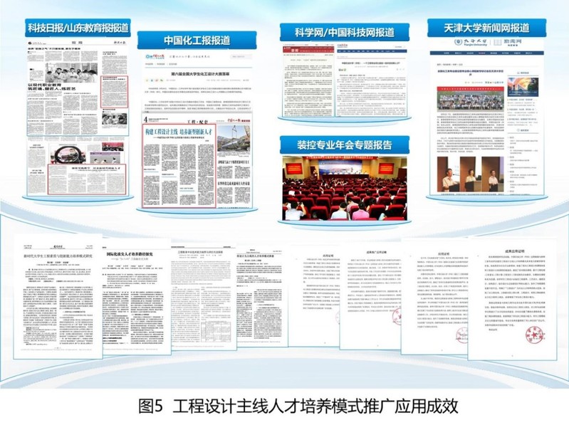 成果实施以来,应用到2012~2022届约1920名本专业学生,并推广到化学工程与工艺、环保设备工程、能源与动力工程等相近专业,培养了一大批优秀工程设计和创新人才。成果被同类院校广泛借鉴,科技日报、中国化工报等媒体多次报道工程设计主线人才培养工作和成效,产生了广泛的社会影响(图2)。