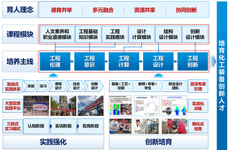 突出装备主体、兼顾化工工艺与控制两翼,对应石化装备设计能力目标,将课程优化为六大功能模块,强化课程定位和课程联系,明确课程模块功能。建设突出工程设计能力培养的高水平课程,实施工程案例教学,理论实践并重,强化工程设计能力培养。创建工程设计主线课程实施路径,将行业卡脖子技术突破作为课程思政元素,培养工程设计必备的工程素养、工艺设计、强度设计、结构设计、综合设计、创新设计等核心能力。