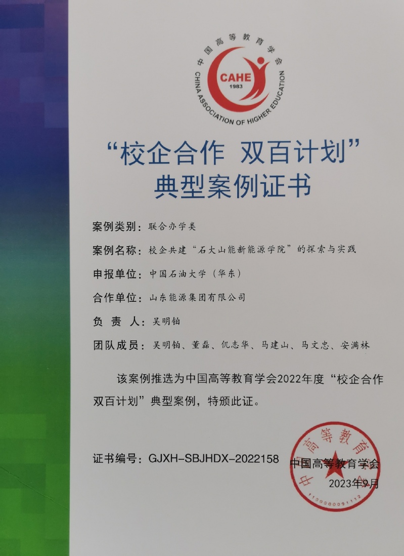 吴明铂教授负责的“校企共建‘石大山能新必赢242net官网’的探索与实践”案例,以石大山能新必赢242net官网建设为例,校企双方根据“协同创新、资源共享、互利共赢”的原则,深化“产教融合、学科融合、科教融合”,构建“五协同”工程教育育人模式,联合开展科研攻关,新建“山能新能源大厦”和“高端化工与能源材料研究中心”,加强校企党建和文化交流,打造“共建、共管、共享”的校企利益共同体。改革经验多次入选典型案例,学科专业建设水平显著提升,教学改革取得丰硕成果,学生创新能力明显增强,为我国校企共建学院的改革与实践提供了成熟的借鉴模式。