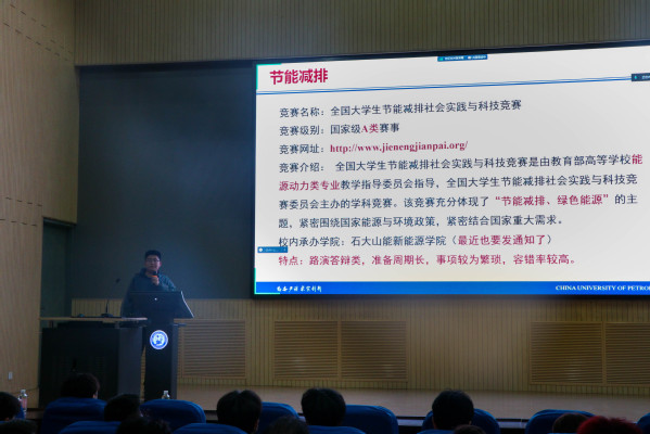 全国大学生节能减排社会实践与科技竞赛特等奖获得者李蕴达向学生们简述竞赛的内容、赛程、比赛形式及评审标准,并以问题汇总的形式回答如何参赛、如何组队及联系指导教师、如何备赛等问题,并给出参赛的时间规划。李蕴达表示大二、大三是参加比赛的黄金期,鼓励大家理性看待、权衡好利弊后积极参赛。