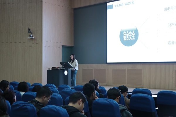 会议伊始,倪萌就安全问题做出强调,提醒学生注意个人财产安全、宿舍用电安全及身体健康。随后,倪萌向学生公布了学院2024届各专业毕业生就业签约公司、保研比例及保研去向,希望借助最新毕业生去向统计信息向学生呈现毕业生发展现状,帮助学生更加系统、全面、慎重地做好未来规划。同时倪萌也提醒准备考研的学生:“不要一直在原地观望等待,时间飞逝,已经是时候明确自己的目标并付诸行动了!”接着,穆海涛上台讲话,他向学生分享了近期所参与毕业生工作的感悟,强调学生要静下心来理性分析自身情况,合理规划未来发展方向,切莫把自己设限在一条道路上,学会放宽视野,转换思路,寻找并了解更多可能性。同时穆海涛也对备考学生提出建议:“劳逸结合、松弛有度,要一直提着一股学习的劲儿并坚持下去!”最后,穆海涛再次强调安全问题并公布考研自习室暂定分配办法。