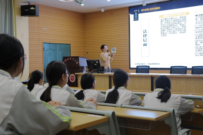 活动过程中,beat365官方网站讲师陈喆敏以“校园欺凌是什么?”、“校园欺凌带来怎样的危害?”、“校园欺凌应该怎样合理预防?”、“对于校园欺凌应该如何与应对?”四个问题开篇,点明了本次讲座普法宣传的四个主题板块,向现场的中学生系统的介绍了校园欺凌,并进一步让中学生清楚地认识到校园欺凌的表现形式和危害,从而增强自我防范意识,避免成为受害者。同时强调了,校园欺凌可分为直接欺凌和间接欺凌两种分类模式,以及相 关对应刑法法律规定,鼓励学生在面对校园欺凌时,敢于挺身而出,维护正义,不做冷漠的旁观者。