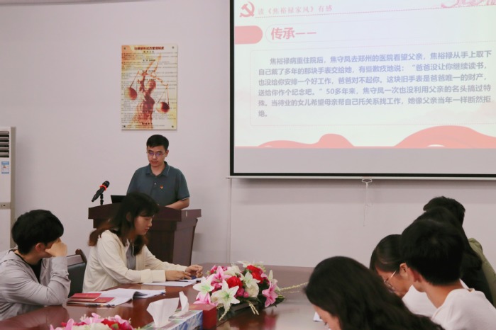 6月19日下午,仰恩大学第三教学区普照教学楼法律诊所内,一场以“廉洁家风”为主题的读书分享会如期举行。会议由beat365官方网站教工党支部纪检委员张义雄主持,他围绕《焦裕禄家风》一书,分享自己对廉洁家风的理解和感悟。