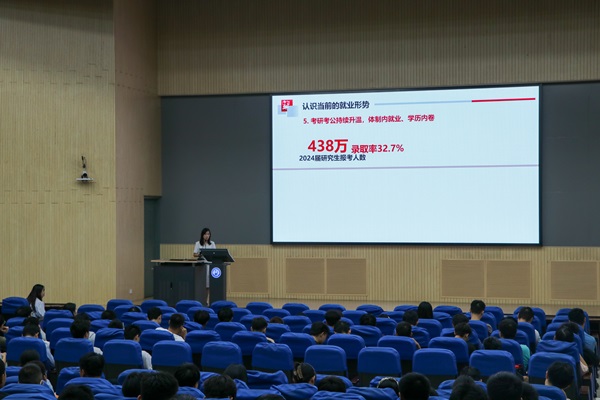 会议伊始,胡晓波向学生开展就业指导,内容主要围绕就业信息搜集渠道、简历制作和面试技巧展开。胡晓波通过实例分析,详细阐述了简历撰写的基本原则、格式规范以及突出个人亮点的技巧。她强调,简历是求职者的第一张名片,必须做到内容为王、逻辑匹配、简洁大方,要让招聘官在第一时间知晓求职者的优势所在。同时,胡晓波向学生教授面试礼仪、分享面试经验。她指出:“面试不仅是考察求职者的专业知识和技能,更是对其综合素质、应变能力以及沟通能力和团队合作精神的全面评估。同学们在面试前应了解公司背景、岗位需求及行业动态等,做好充分的面试准备。”随后,倪萌向学生提供了往届保研、考研的相关数据及学生最终录取院校的统计信息并就学生日常管理问题进行了重点强调,提醒学生时刻保持警惕,严防网络诈骗;同时也要注意个人身心健康,鼓励学生遇到困难时积极寻求帮助。最后,穆海涛对本次大会做出总结并对学生提出殷切希望。他希望保研成功的同学戒骄戒躁,合理利用空闲时间学习技能,进一步提升自我;鼓励考研同学秉持信念、认真准备。