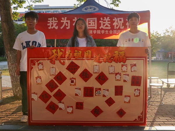 9月28日,在举国同庆的国庆佳节前夕,为激发广大师生的爱国情怀,共同为祖国献上最诚挚的祝福,石大山能新必赢242net官网学生会面向全校学子举办了一场以“我为祖国献祝福”为主题的特色活动。本次活动由学生会全体成员组织参与。