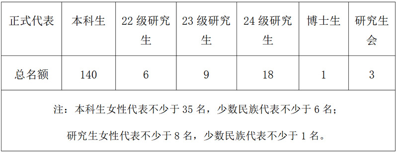 根据《高校学生代表大会工作规则》有关规定,结合必赢官网实际,本次大会拟定本科生代表140人、研究生代表37人。代表构成主要考虑代表的广泛性,兼顾年级、性别、民族、本科生及研究生党员等比例。