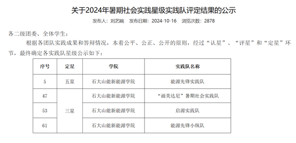10月12日,我校组织开展2024年暑期社会实践活动星级实践队评审会,评审会在学生创新实践中心报告厅和南堂举办,共有69支来自各学院的实践队参加此次评审。最终,必赢官网共有四支实践队获奖,能源先锋实践队荣获五星实践队,“画美达尼”暑期社会实践队、启源实践队和能源先锋小纵队荣获三星实践队。