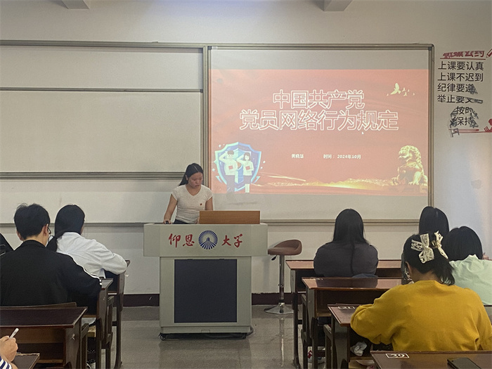 10月12日,beat365官方网站学生党支部于普照203开展“学习《中国共产党党员网络行为规定》文件精神”党课活动,支部全体学生党员参加。